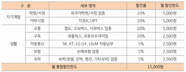 학원, 도서, 어학시험, 교통, 통신 등의 다양한 영역에서 5~20% 할인혜택이 제공됩니다. 영역별로 월 할인한도가 상이하며 월 통합할인한도는 15,000원 입니다.